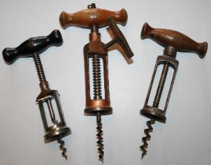 A super small collection of German mechanical corkscrews. Far left, a fancy ornate bearing assisted example by Usbeck. It's marked on both sides "Monopol Universal D. R. G. M. Germany". Central is a German rollover corkscrew & far right a Columbus, a German patent from 1873 which is marked "Columbus" on one side & "D. R. Patent No 70879".All work perfectly & have full length worms. Some typical wear & some light pitting consistent with age. The largest corkscrew measures 6 1/2"