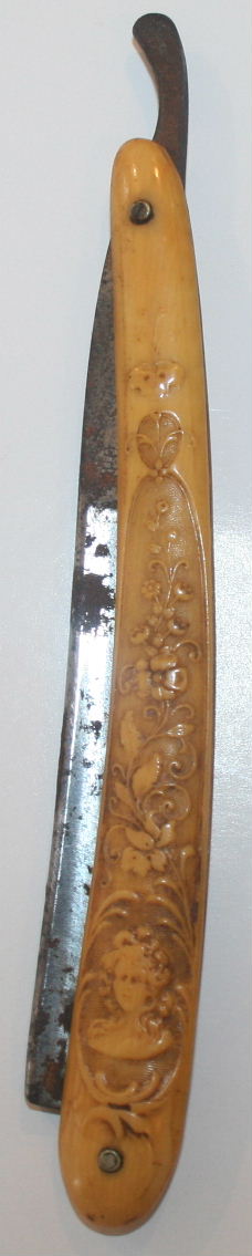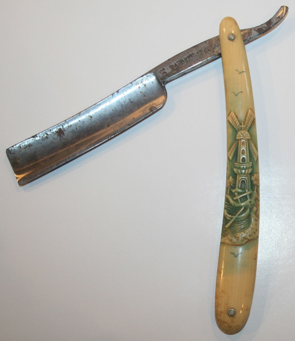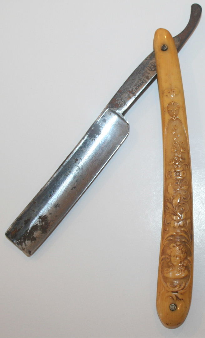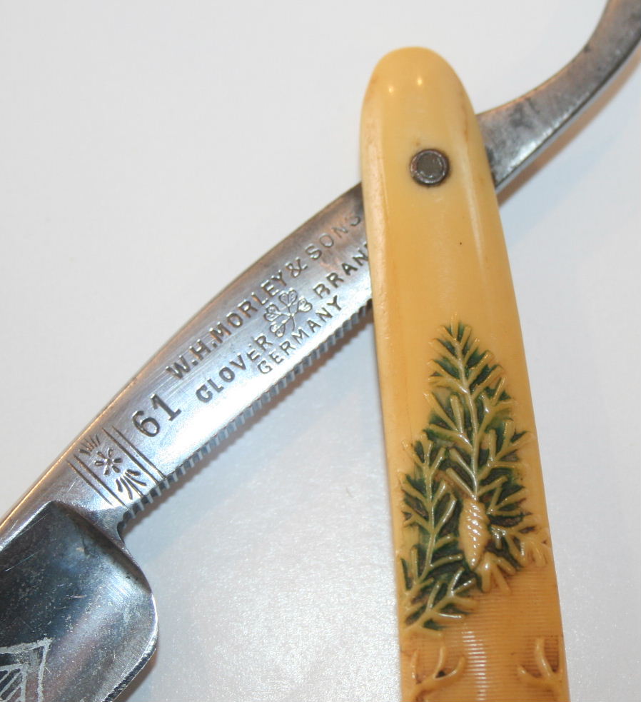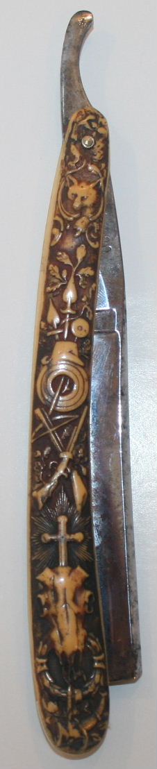 A wonderful antique celluloid razor depicting a symbolic Germanic Stag hunting scene on one side, while the other side depicts symbols which include: a fox head, rifle, crossbow, spears, skull, cross, horn & wreath.