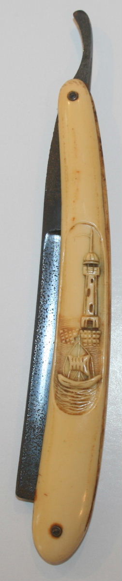 A beautiful antique celluloid straight razor depicting a Lighthouse with a sailing boat in the foreground.