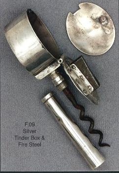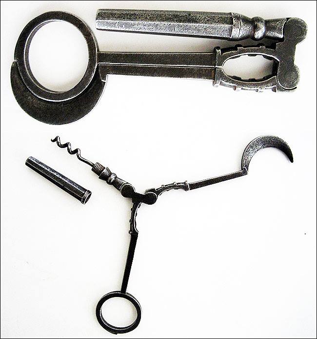 Higher levels of sophistication have materialized since the event chronicled above. Recently I was shown an 18th Century steel combination tool with a corkscrew. You can find a similar example in 'Corkscrews of the Eighteenth Century', a fine book by Bert Giulian...see illustration number 95 on page 99, far right...combination including corkscrew, nut cracker, and hoof pick. The piece in question was much the same as the example in the book, but the sheath had a pillared design (octagonal cross section).